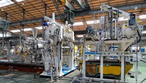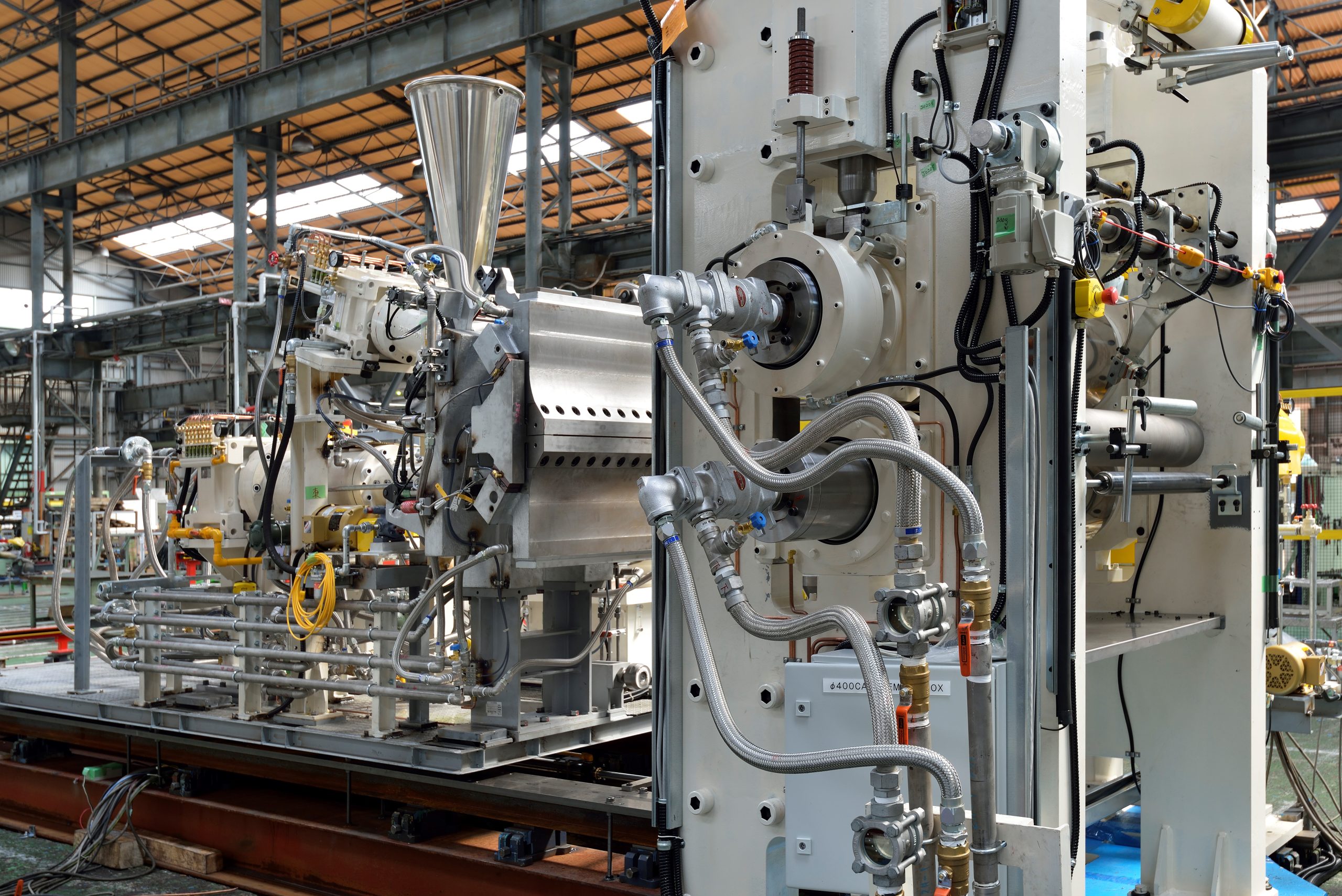 The duplex roller head unit consists of two extruders, a die head, and vertical two roll calender. The rubber is evenly distributed in the die head over its entire width, and is then fed into the calender nip. A feedback system of control varies the RPM of the extruder screw or calender speed so that high quality rubber sheet (up to 2300 mm wide) can be produced in thickness from 0.5 mm to 20 mm or greater.